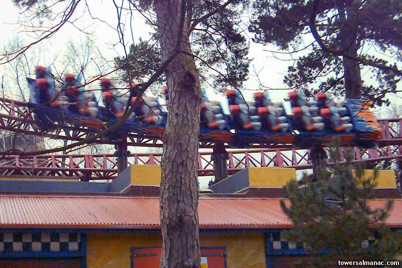 From the same standpoint, we look at a train halfway around the ride circuit, as it follows the earlier turn.