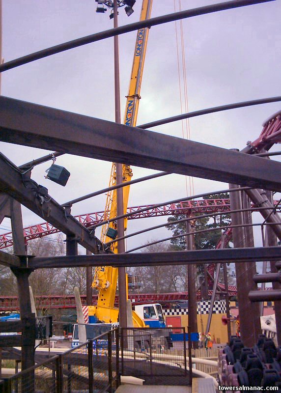 A large crane lifted the food stall into place. It was then used to put the canopy back on Corkscrew's station.