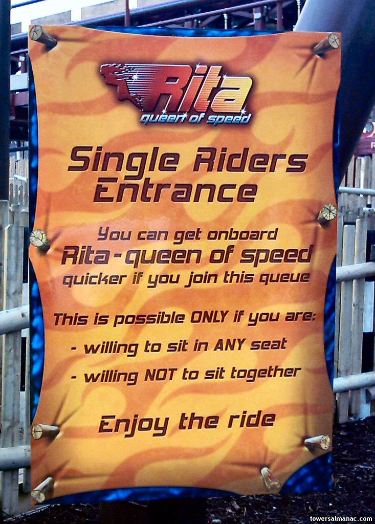 The restrictions sign next to the entrance of Rita's Single Rider Queue (SRQ).