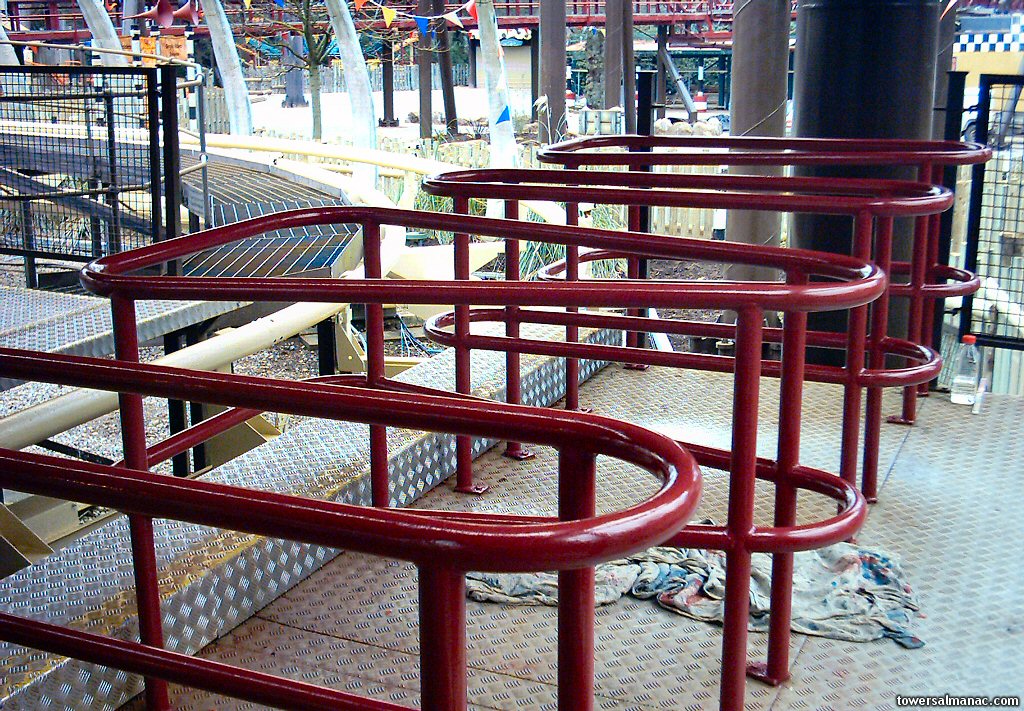 The loading bay railings in the Corkscrew station are being repainted a bold red, matching Rita's track colour.