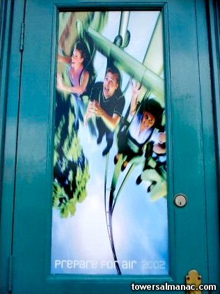 The poster appears on the door to the Kodak booth at the top of Towers Street. A vague artist's impression of the ride indicates to us that this is not what we should expect the ride to look like. It is there to give the public the idea of what a flying coaster is.