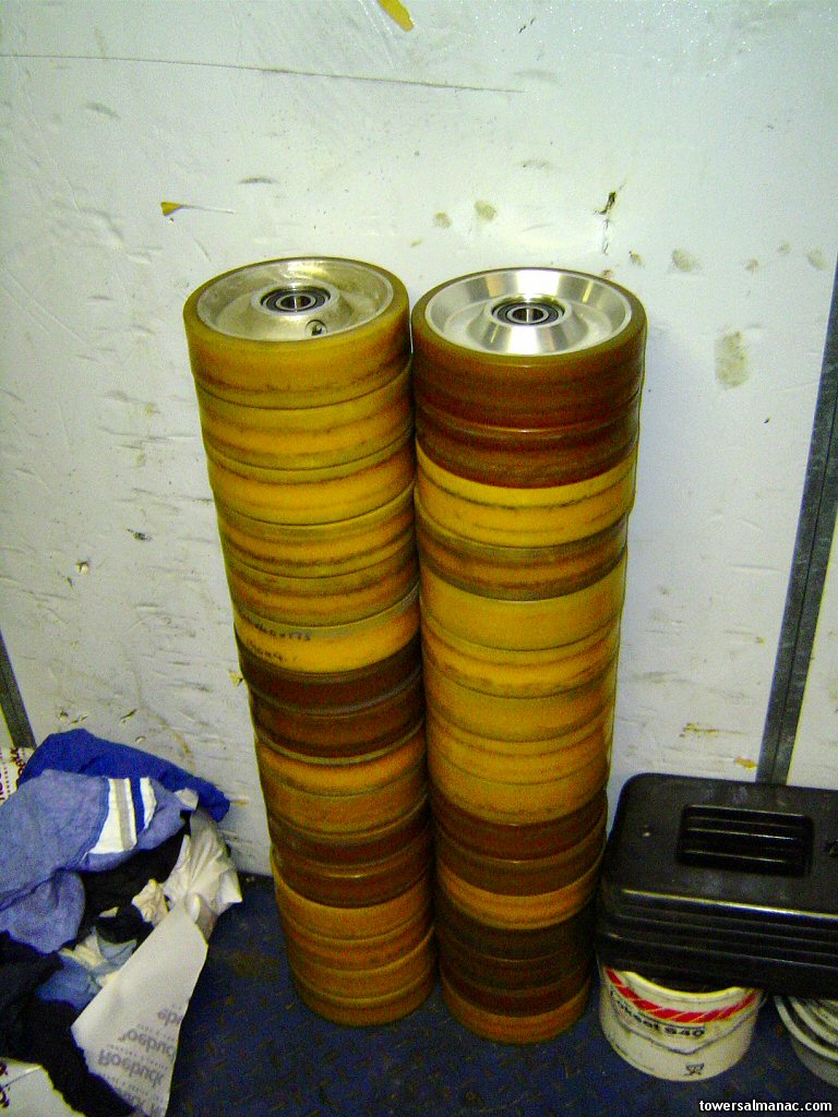 In the upper level, spare ride wheels are stacked together, as well as many other spare ride parts.