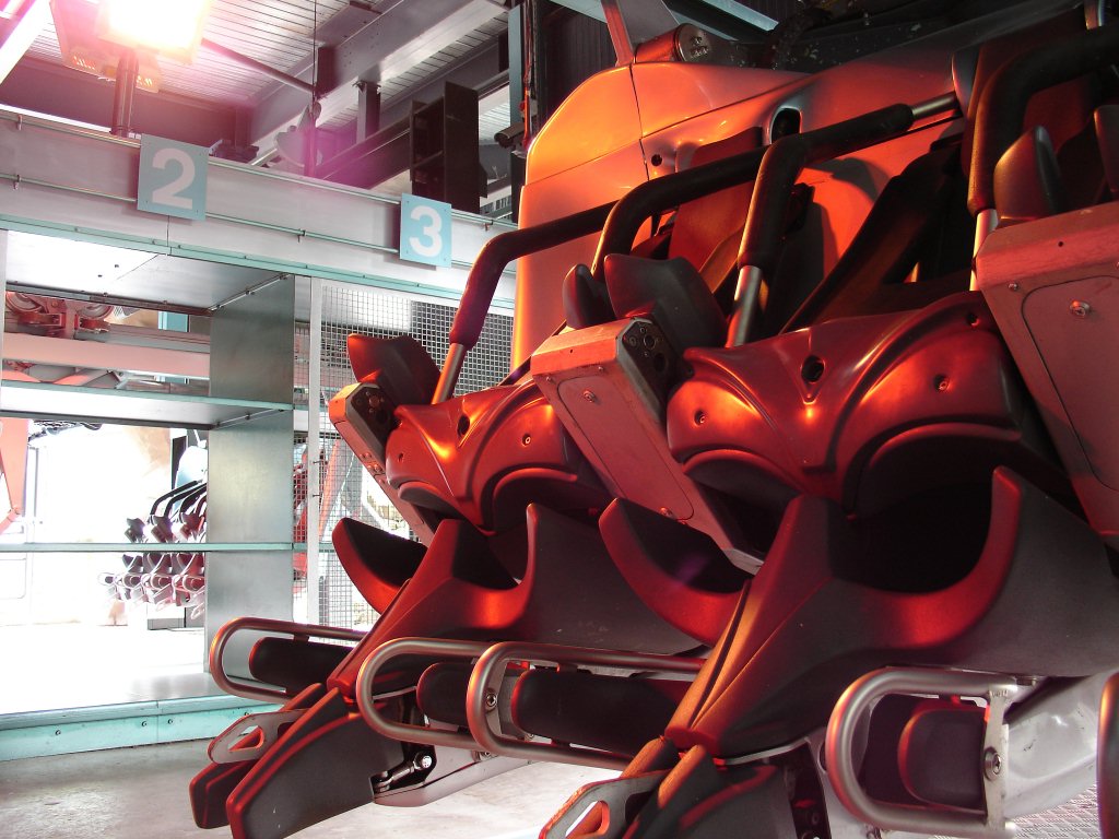 An Air craft in the station, bathed in the orange glow of the heater above.