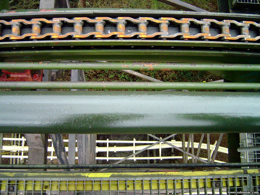 At the top of the lift hill, looking downwards.