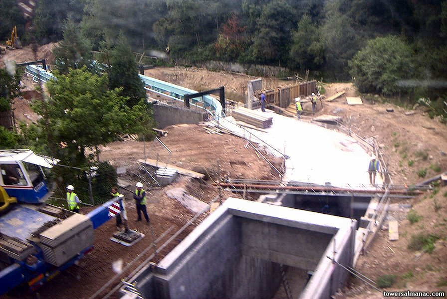 The concrete roof of the first tunnel is now being placed, suggesting that track has been placed. Lift hill motors are also being installed.