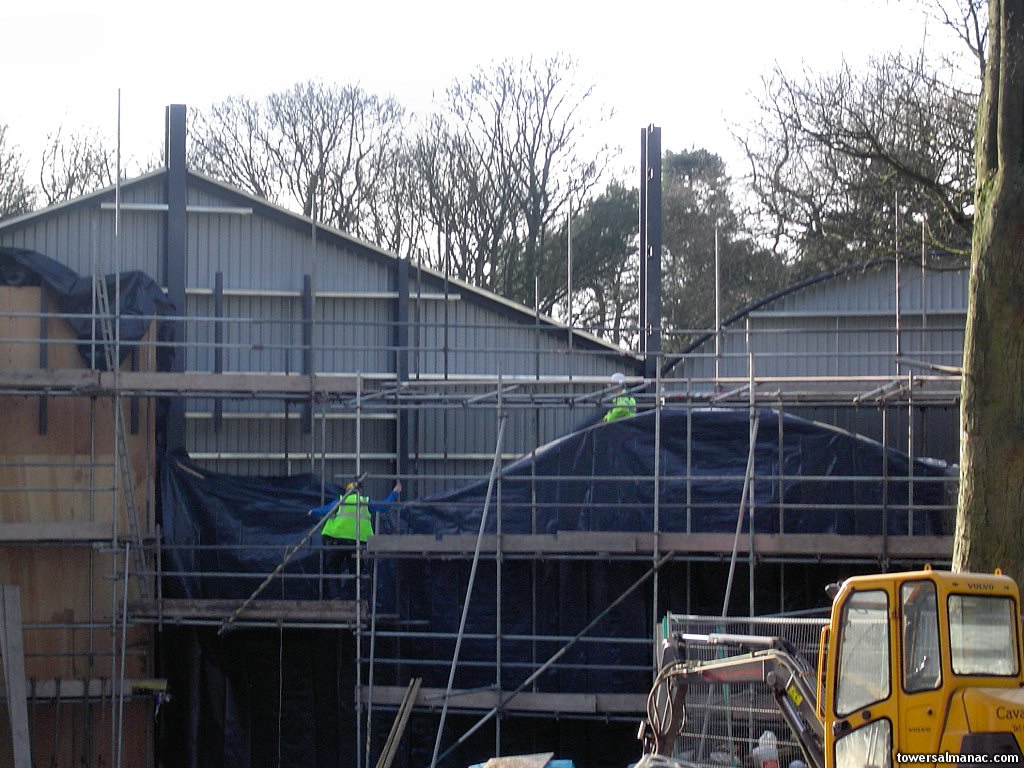 Workmen on the scaffolding surrounding the original warehouse.