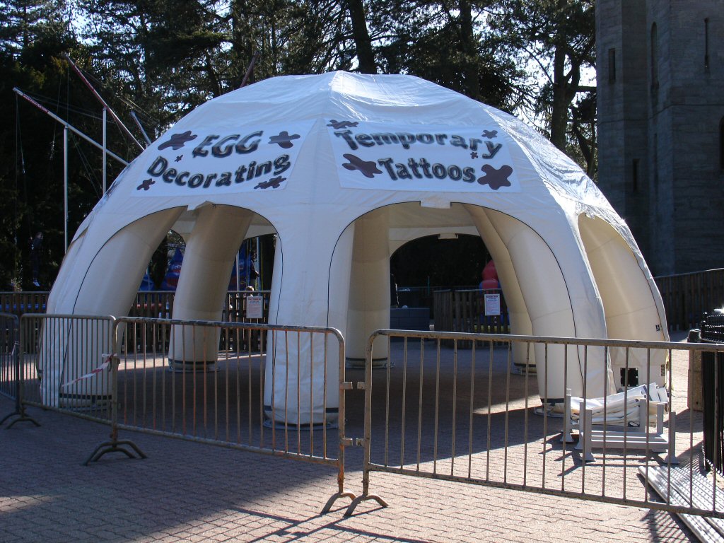 An inflatable tent arrives for 'egg painting' and 'temporary tattoos'.