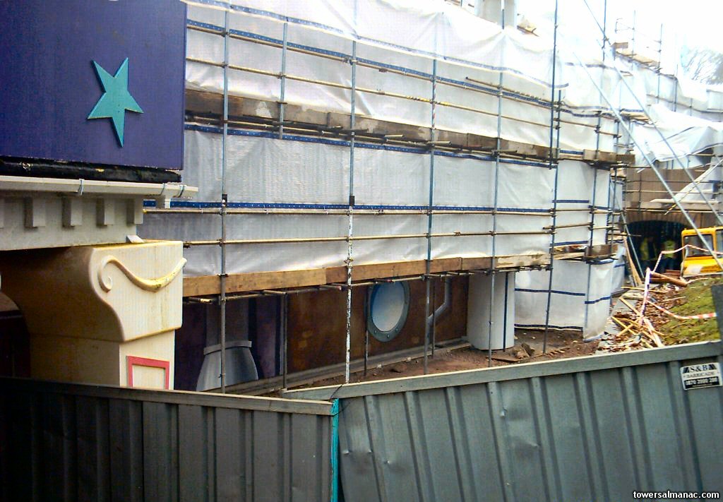 Underneath the scaffolding surrounding the building's extension, parts of the new fascia are visible.