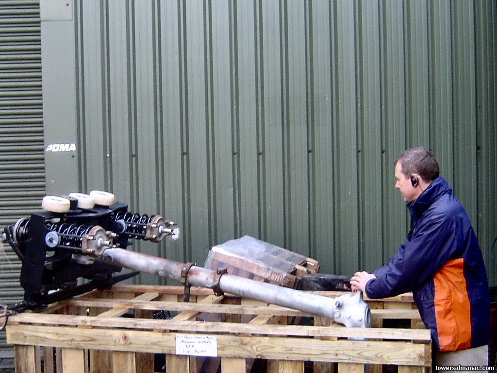 Head of Engineering, Terry Dunn, shows a major component of the Sky Ride cars. To the left of the shot you can see the wheels that attach to the cable.