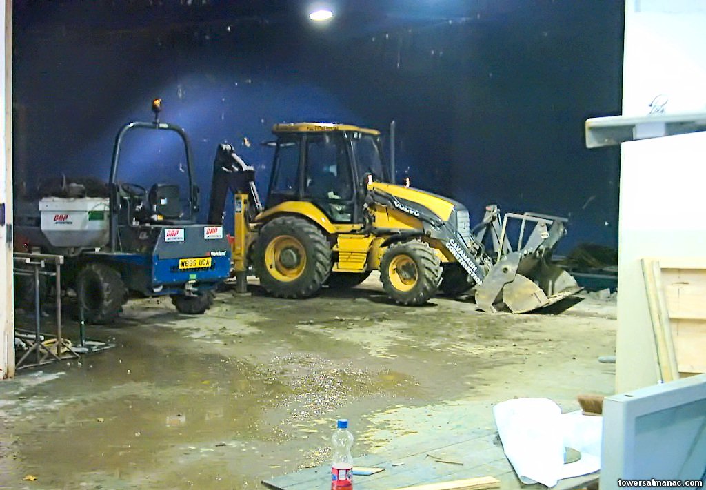 Vehicles that were used to do the channel work sit inside the building.