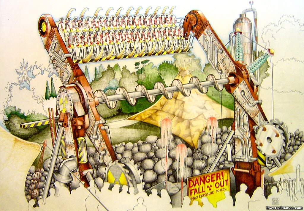 Concept art for Ripsaw. Note that while a lot of the suggested theming became a reality, several pieces (most notably the blades attached to the gondola itself) did not.
