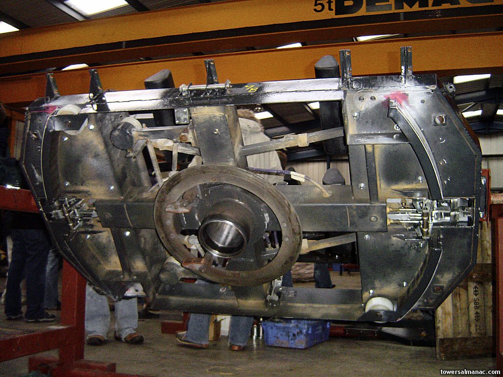 This rig, built by the park themselves, allows engineers to easily access the underside of the cars.