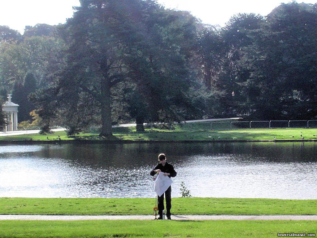 One worker studies a plan in front of the lake where the show will take place.