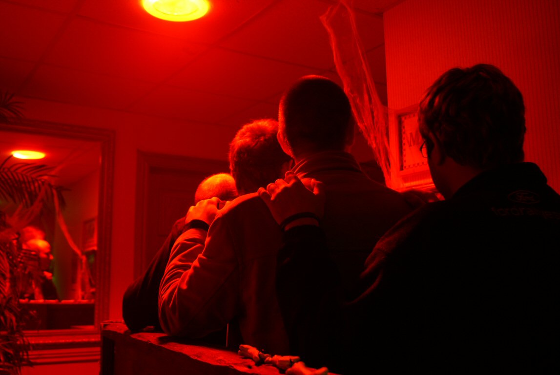 Guests put their hands on the shoulders of the person in front of them, ready to enter the maze.
