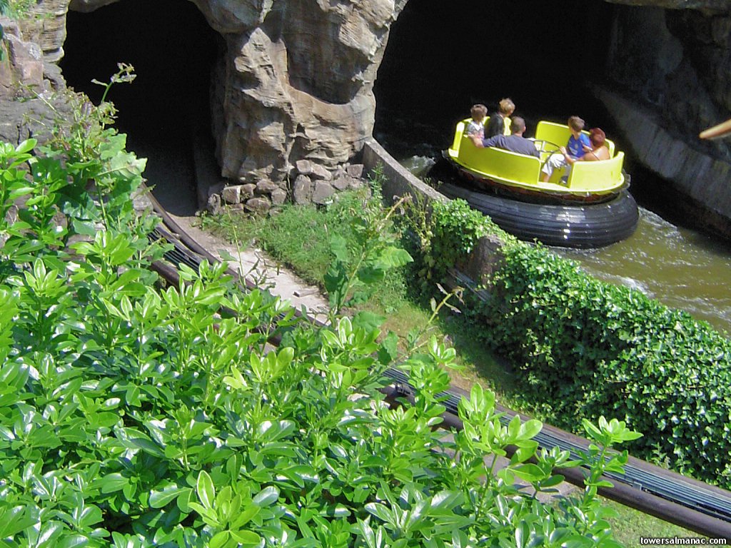 The exit of the tunnel, which you can see also houses part of the Congo River Rapids channel. The first half of the train continued up the hill before rolling back towards the second half.