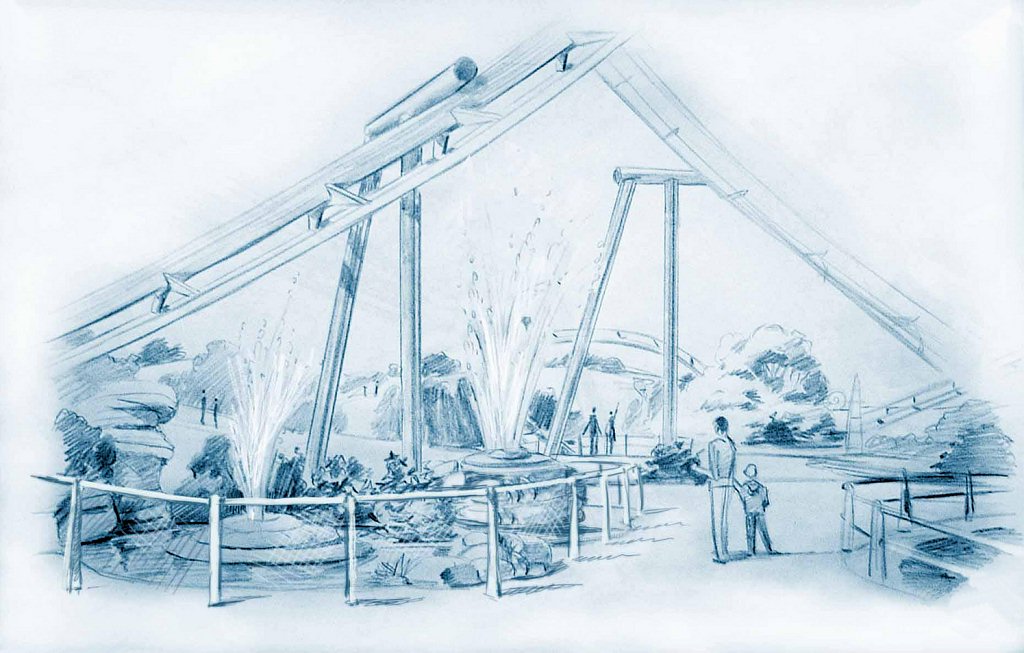 These water geysers would have been positioned around where the on-ride photo currently is - just after the first drop underneath the Monorail.
