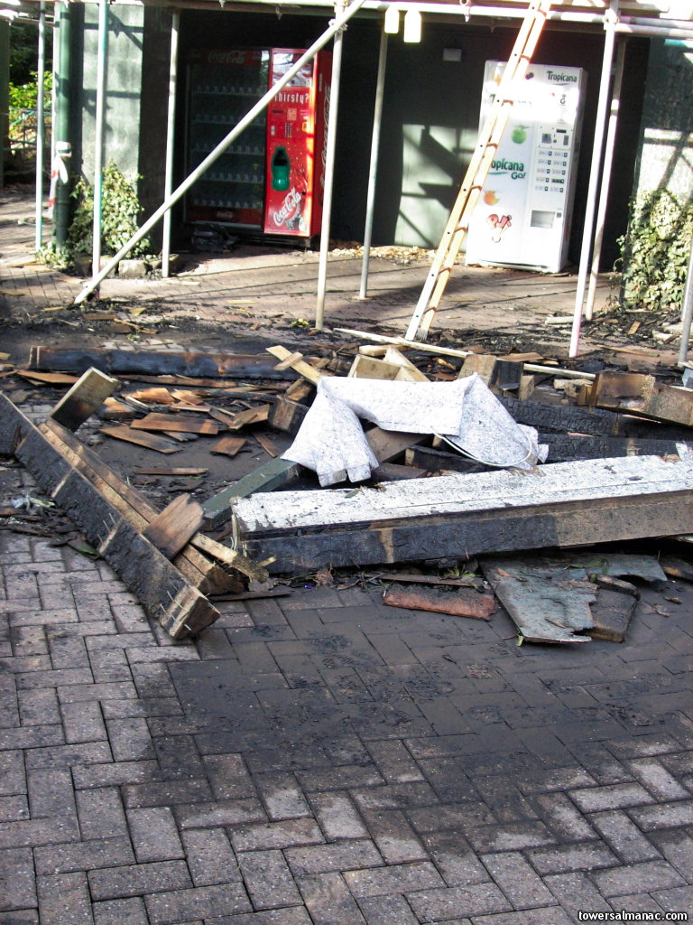 Charred bits of wood lie on the ground next to the Sky Ride.