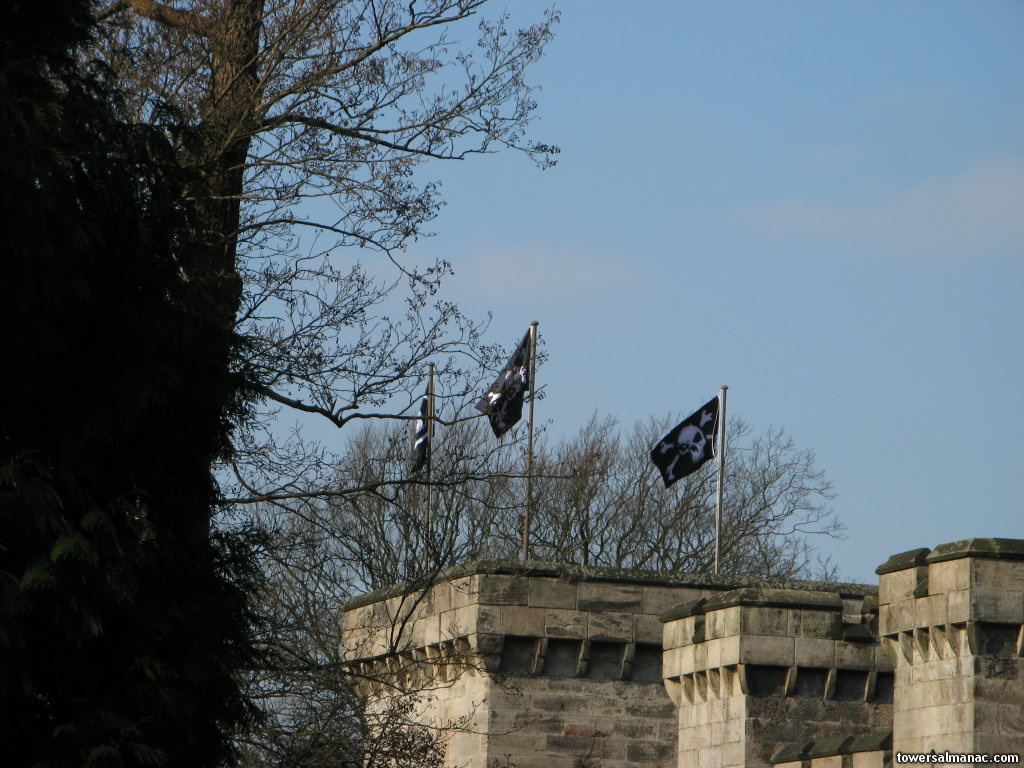 The skull and crossbones fly on each corner of the courtyard buildings.