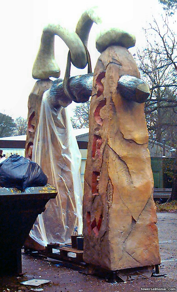 Corkscrew's entrance sign, removed for the time being as the ride's queueline is being remodeled. The sign is being stored outside the Tussaud's Art Workshop behind Cred Street.