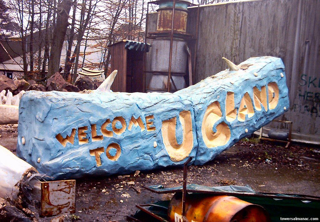 The Ug Land entrance sign. It has been removed temporarily to allow large vehicles access to the construction site.