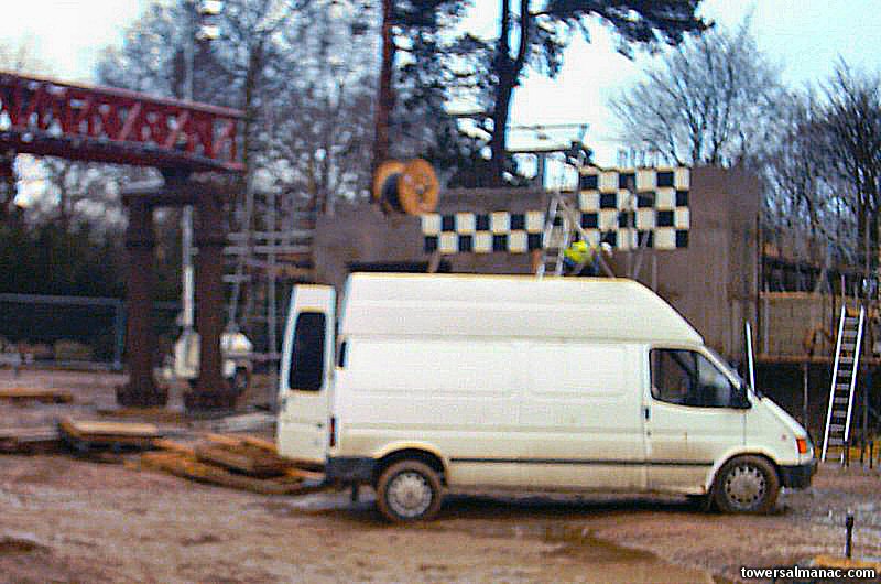 Theming work has begun! In this photo, you can see that a chequered flag pattern is being applied to the side of the launch hydraulics building.