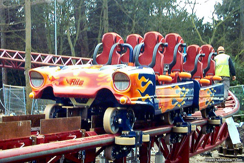 The train in the brake run. Tying in with the already apparent theming, the cars have a very striking "hot rod" image about them.