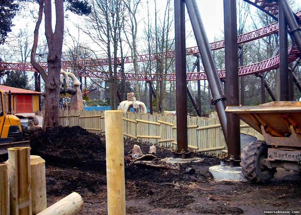 Corkscrew's queue line entrance, with Rita looming above.